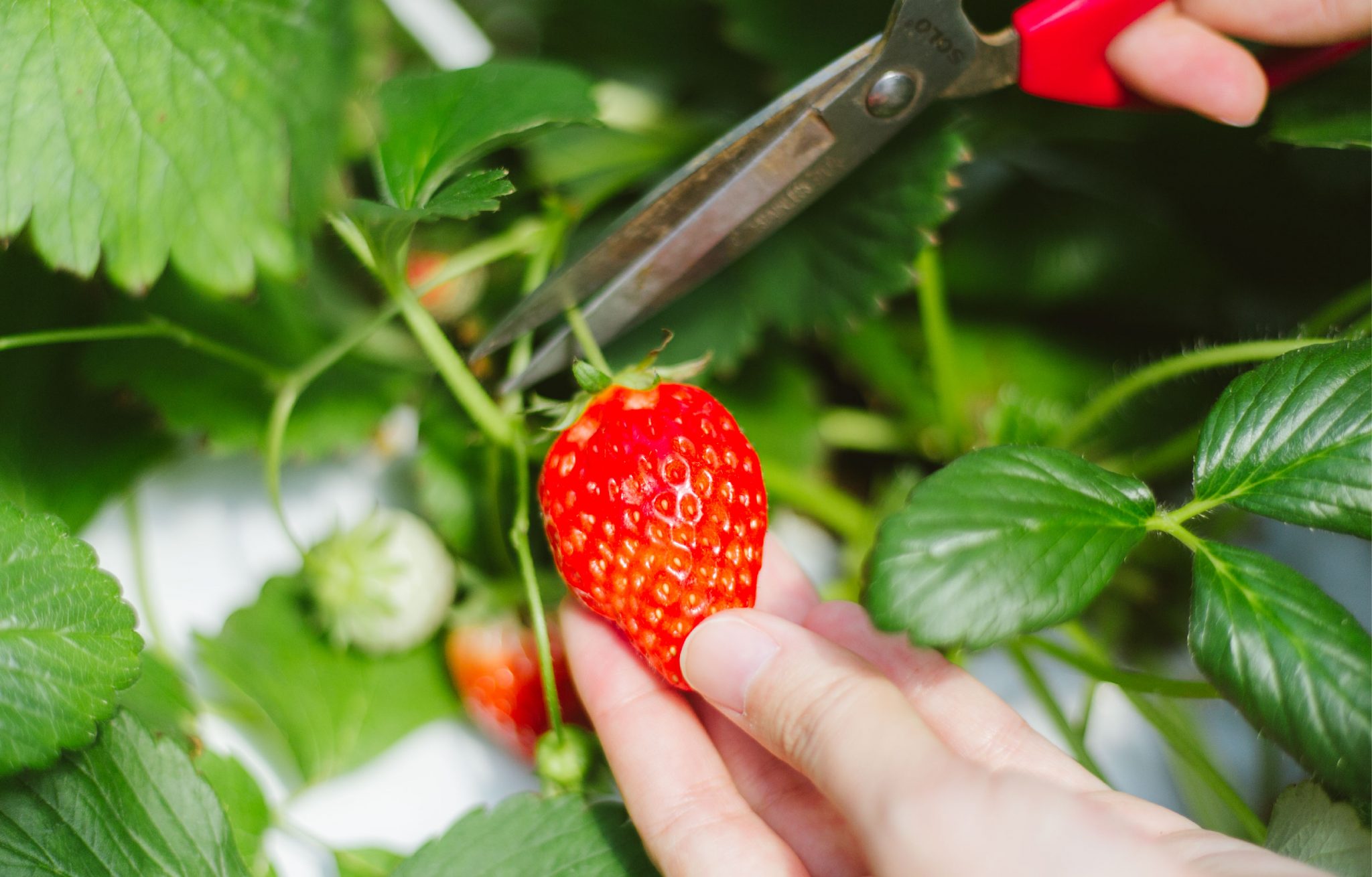 เมื่อสตรอว์เบอร์รี่มีอายุครบ 120 วัน ซึ่งเป็นช่วงเวลาที่สตรอว์เบอร์รี่ ‘สุข’ และหวานที่สุด เราจึงค่อยเก็บเกี่ยวและคัดสรรลูกที่โตที่สุดเพียงลูกเดียวของต้นเป็นตัวแทนของเพื่อนๆ ไปมอบความสุขให้คนกิน ซึ่งข้อดีของการมีแปลงปลูกภายในประเทศ ทำให้เราไม่ต้องเก็บเกี่ยวล่วงหน้าเพื่อเผื่อให้สตรอว์เบอร์รี่สุกระหว่างการขนส่งนั่นเอง
